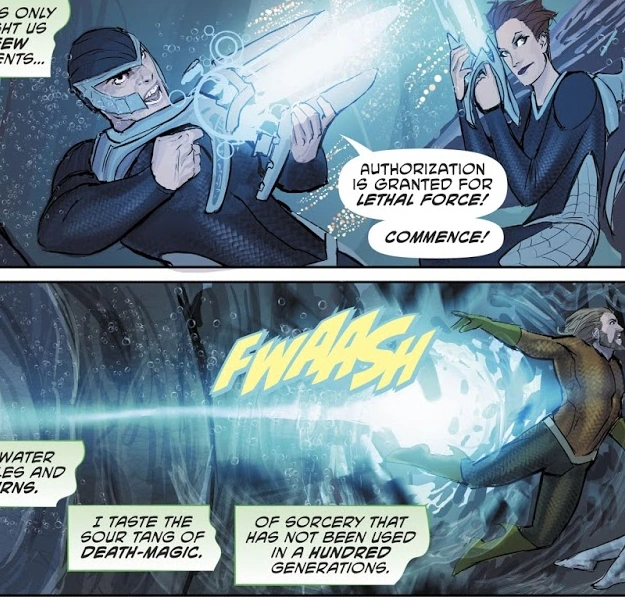 Death-Magic is a powerful magic utilzied by the Drift after receiving various enchantments from the Silent School during Corum Rath's reign in Atlantis. Said to have not been used in a hundred generations by Aquaman, the magic is utilized in a rifle-like construct and is capable of drawing pain from the aforementioned hero.[1]